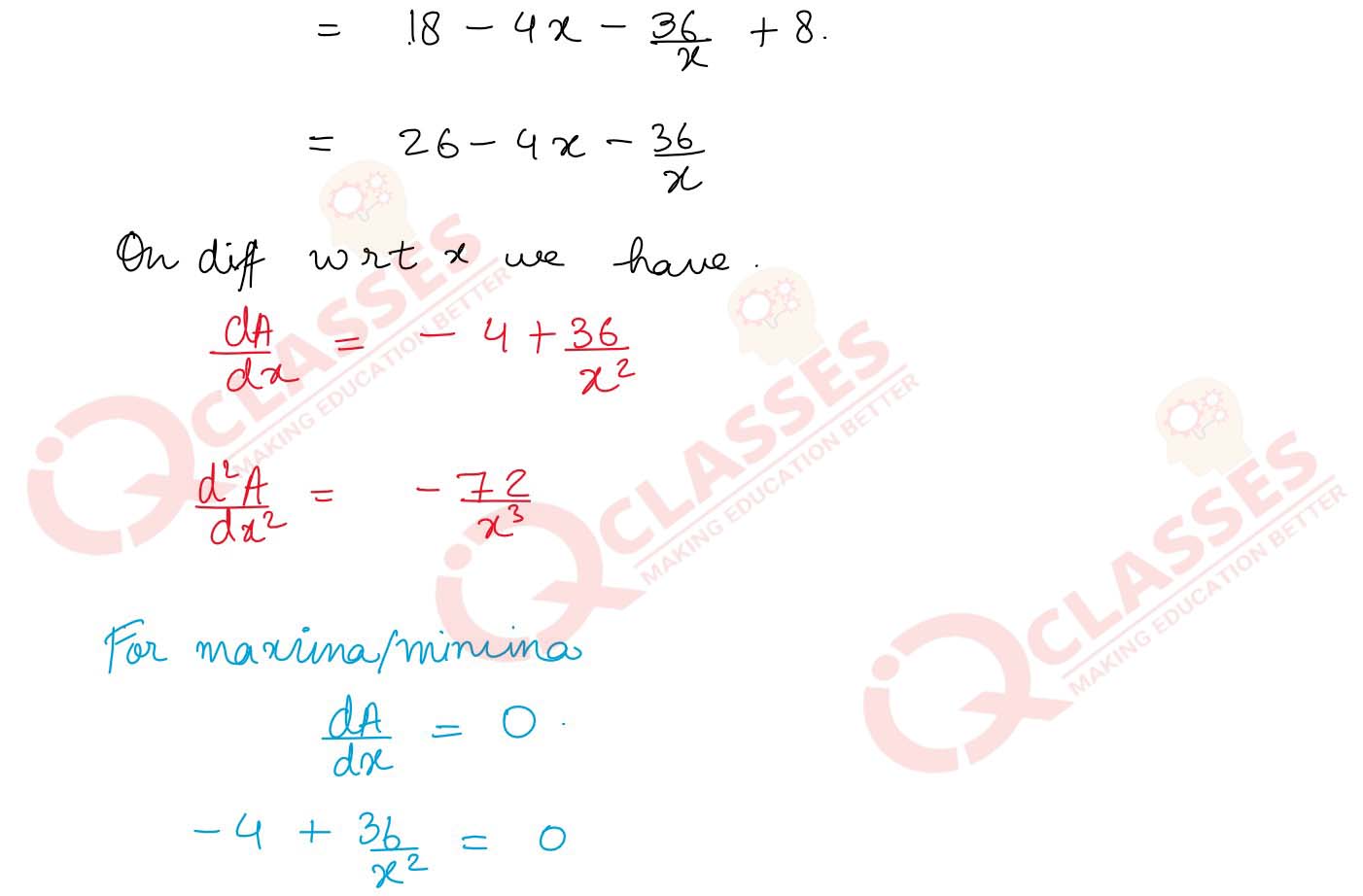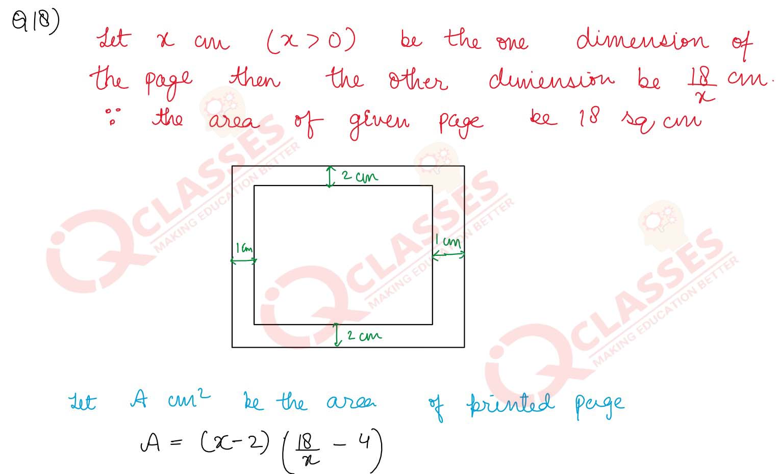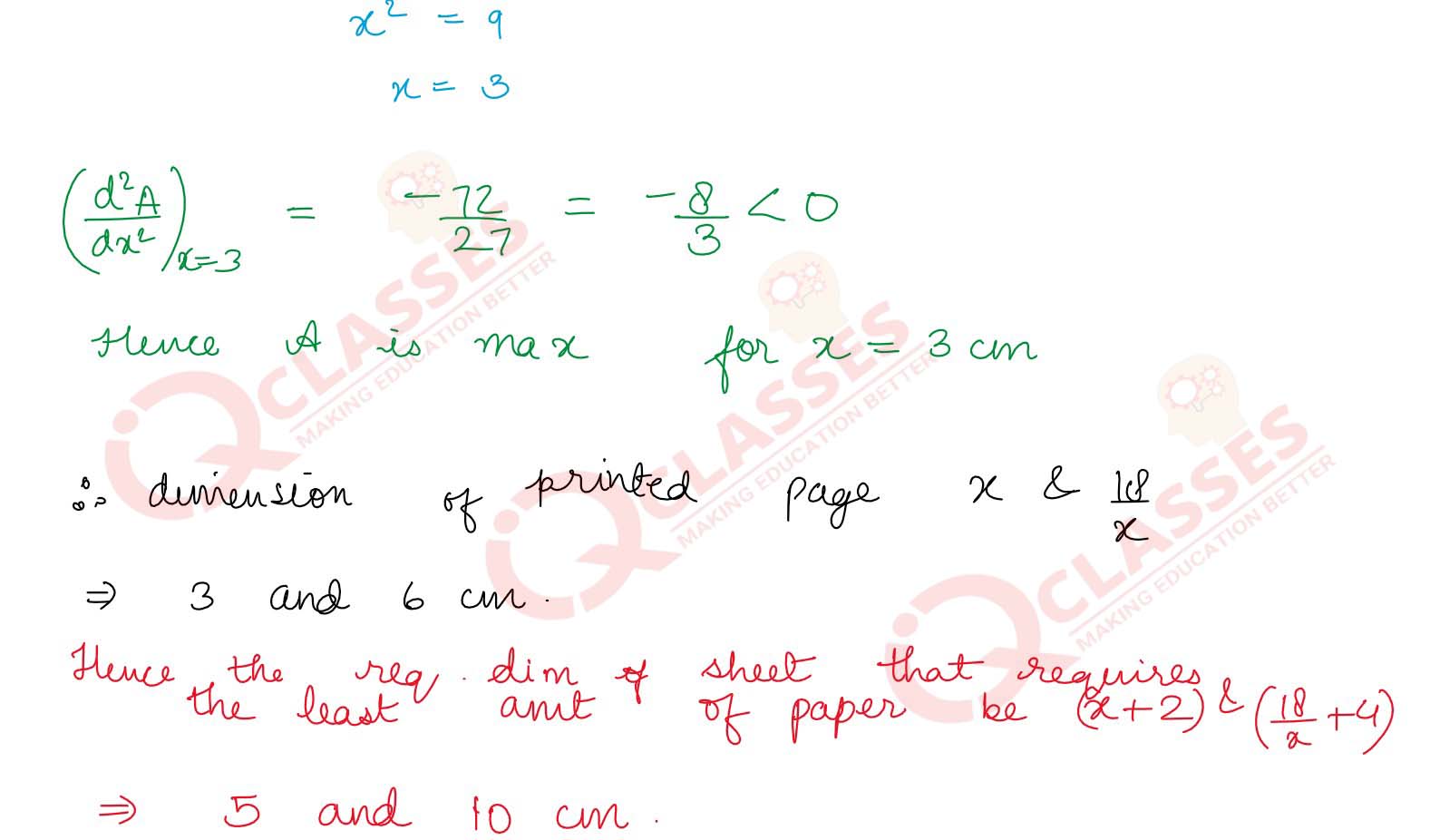 Q18 A sheet of paper is to contain 18 cm2 of printed matter. The margin at the top bottom are 2 cm and the sides 1 cm each . Find the dimensions of the sheet which acquire the least amount of paper.