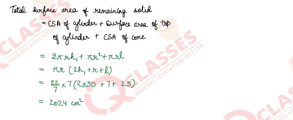 Q12 From a solid cylinder of height 30 cm and radius 7 cm, a conical cavity of height 24 cm and of base radius 7 cm is drilled out. Find the volume and the total surface of the remaining solid.