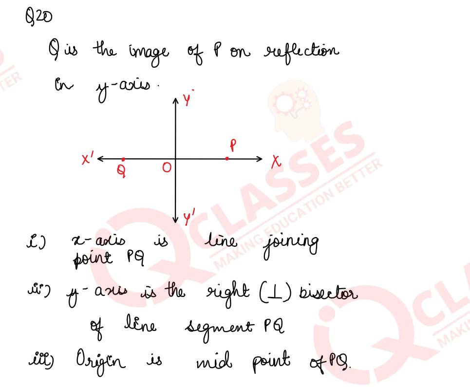 Q20 Given two posts P and Q, and that (1) the image of P on reflection in y-axis is the point O and (2) the mid point of PQ is invariant on reflection in x-axis. Locate (i) the x-axis (ii) the y-axis and (iii) the origin.