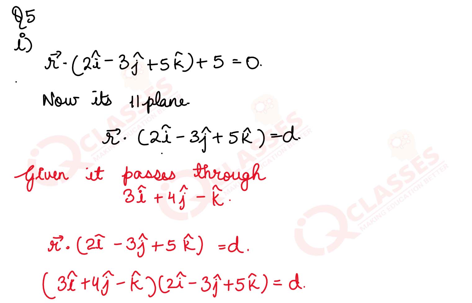(i) Find the equation of the plane through the point 3i^ + 4j^ -k^ and parallel to the plane r→(2i^-3j^ +5k^) +5=0.