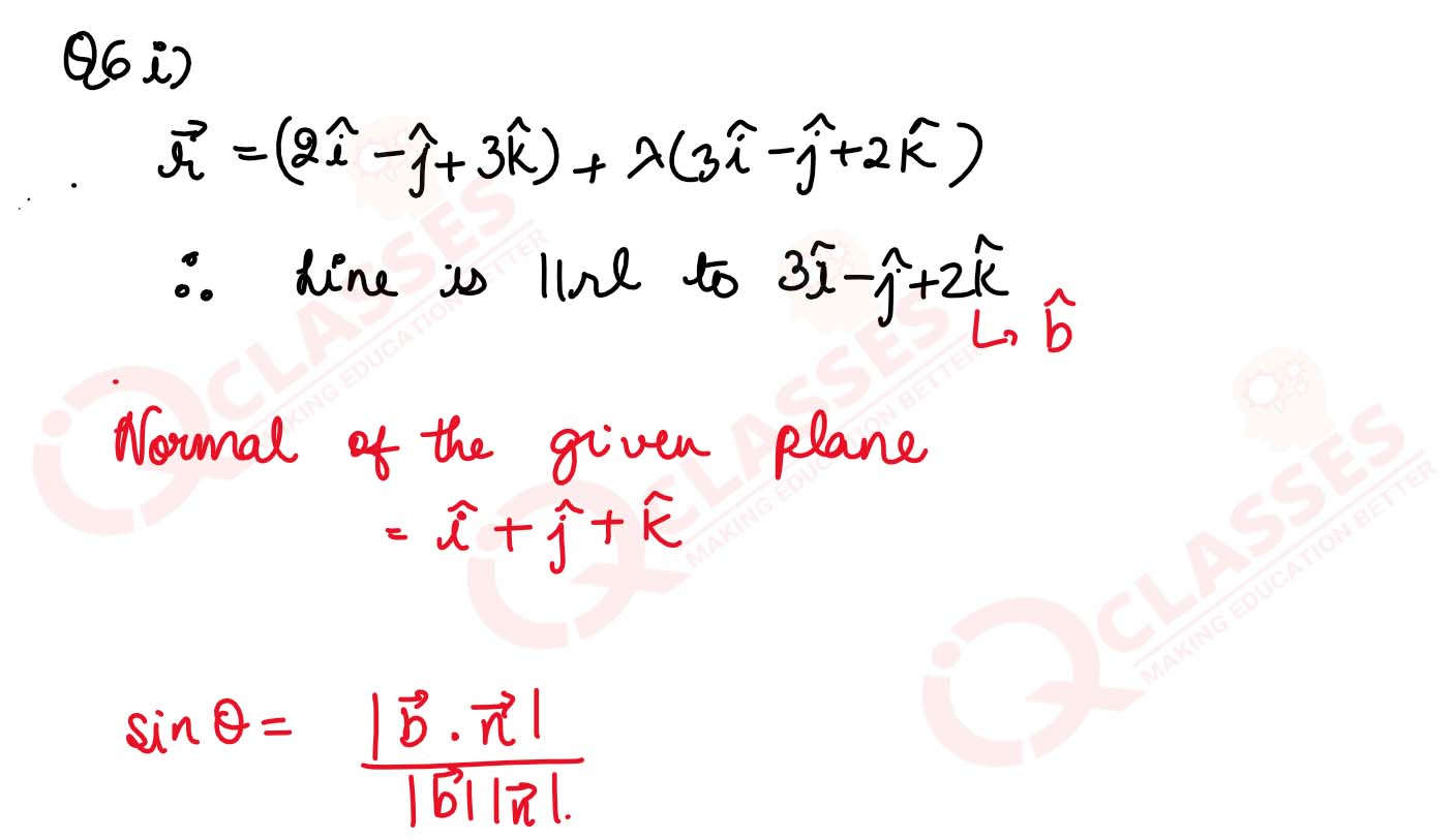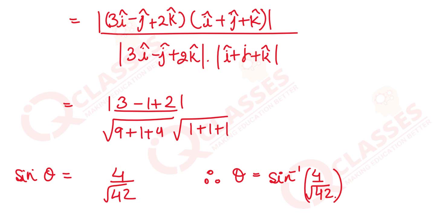 (i) Find the angle between the line r→ = (2i^-j^+3k^)+λ(3i^-j^+2k^) and the plane r→(i^+j^+k^) =3.
