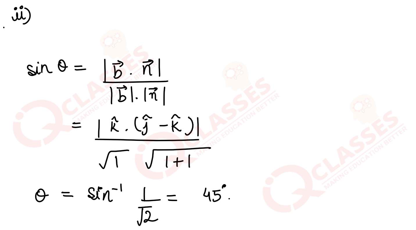 (ii) Find the angle between the line r→ = 2i^-3j^ +λ(k^) and the plane r→(j^-k^) =7.