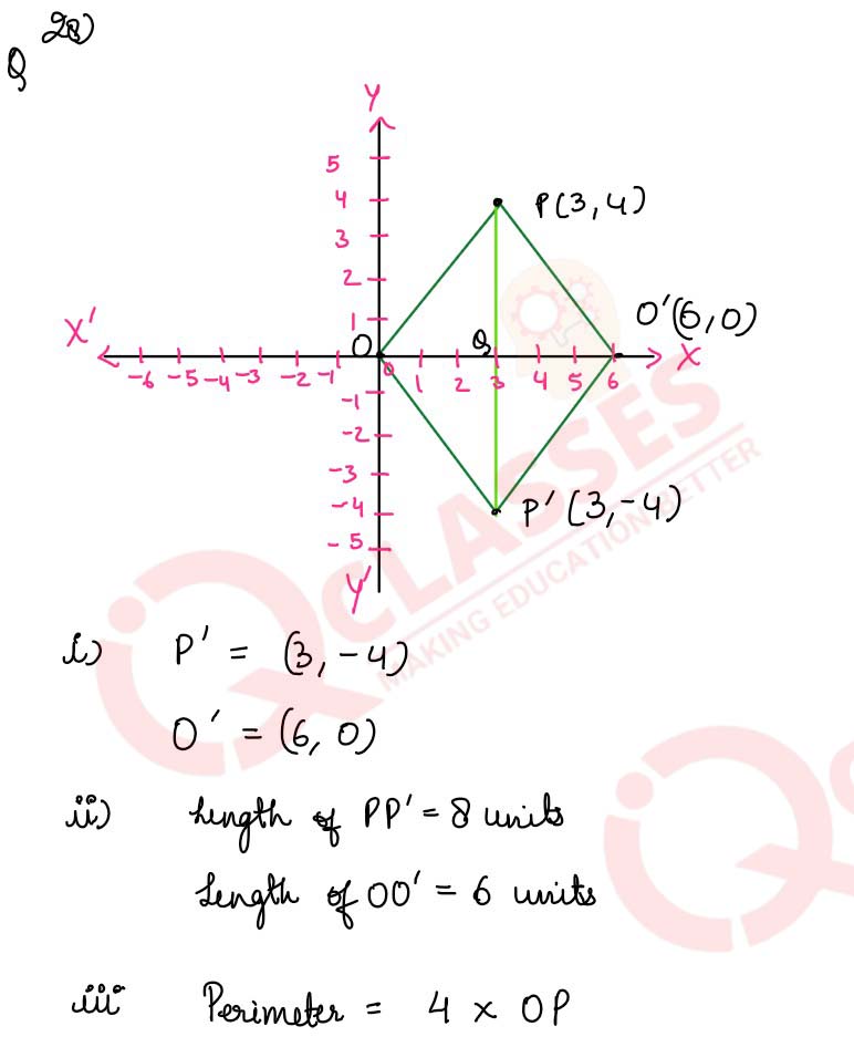 Q28 The point P(3, 4) is reflected to P’ in the x-axis and O’ is the image of O (origin) in the line PP’. Find :