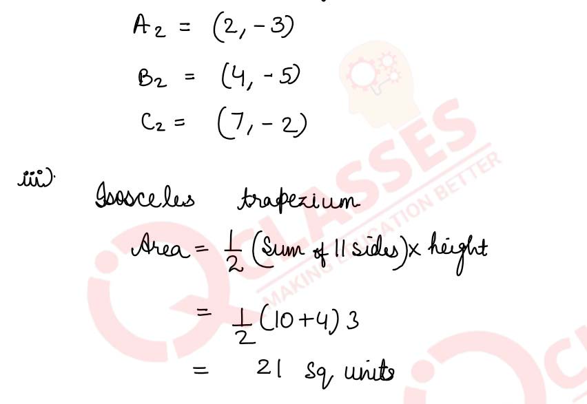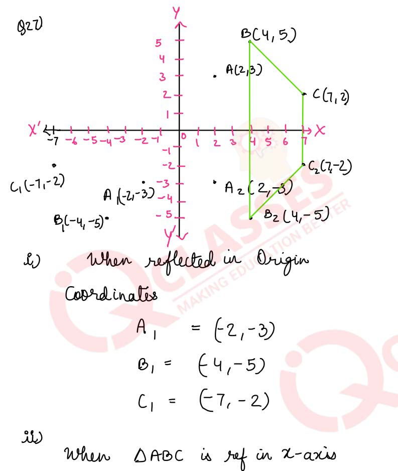 Q27 The points A(2, 3), B(4, 5) and C(7, 2) are the vertices of △ABC. (i) Write down the coordinates of A1, B1, C1 if △A1B1C1 is the image of △ABC when reflected in the origin. (i) Write down the coordinates of A2, B2, C2 if △A2B2C2 is the image of △ABC when reflected in the x-axis. (iii) Assign the special name to the quadrilateral BCC2B2 and find its area.