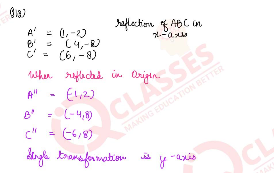 Q18 The triangle ABC where A (1, 2), B (4, 8), C (6, 8) is reflected in the x-axis to triangle A’B’C. The triangle A’B'C’ is then reflected in the origin to triangle A”B”C”. Write down the coordinates of A”B”C”. Write down a single transformation that maps ABC onto A”B”C”.